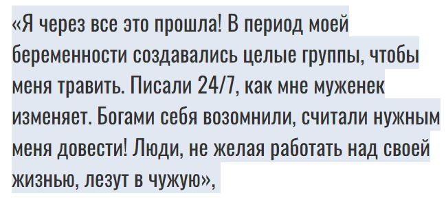 Все это, безусловно, очень больно бьет по чувствам Орловой. Видя ее состояние, коллегу решила поддержать Ксения Бородина. Она вспомнила, что будучи беременной от Курбана Омарова тоже подверглась травле. Ее брутальный муж любил погулять. Завистниц было море. И Бородину стали досаждать сообщениями об изменах Омарова. Стоит отметить, что любая женщина чувствует, когда мужчина ей изменяет. А тут еще и прямо в лицо тыкают этим, группы создают в Сети.
