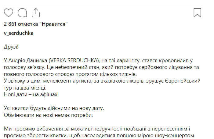 У Андрея Данилко, на фоне ларингита, произошло кровоизлияние в голосовую связь. Это опасное состояние, которое требует серьезного лечения и полного голосового покоя в течение нескольких недель. В связи с этим, менеджмент артиста, по указанию врачей, сдвигает Европейский тур на два месяца. Новые даты – на афишах! Все билеты будут действительны на новую дату. Обменивать на новые нет необходимости. Мы приносим свои извинения за возможные неудобства связанные с переносом и просим сохранить билеты, чтобы насладиться в полной мере шоу-концертом VERKA SERDUCHKA уже в мае!» - говорится в сообщении.