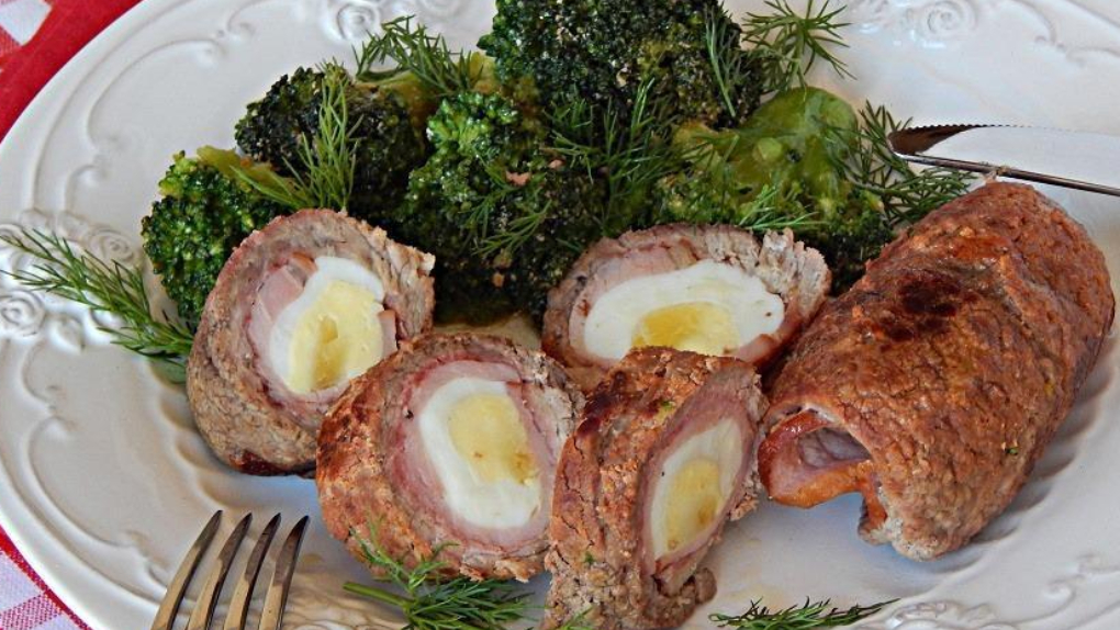 - На каждый кусочек мяса кладем ветчину и половину вареного яйца, сворачиваем рулетиком (можно обвязать ниткой).