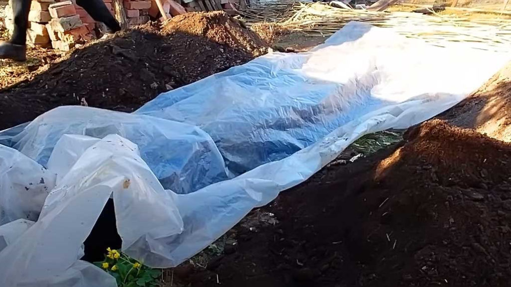 Первым делом для пакетной грядки нужно вынуть почву на глубину примерно 50 см или чуть более (80 см максимум), затем застелить дно и стены этой ямки плотной полиэтиленовой пленкой, тем самым воспрепятствовать проникновению воды в более глубокие слои почвы.