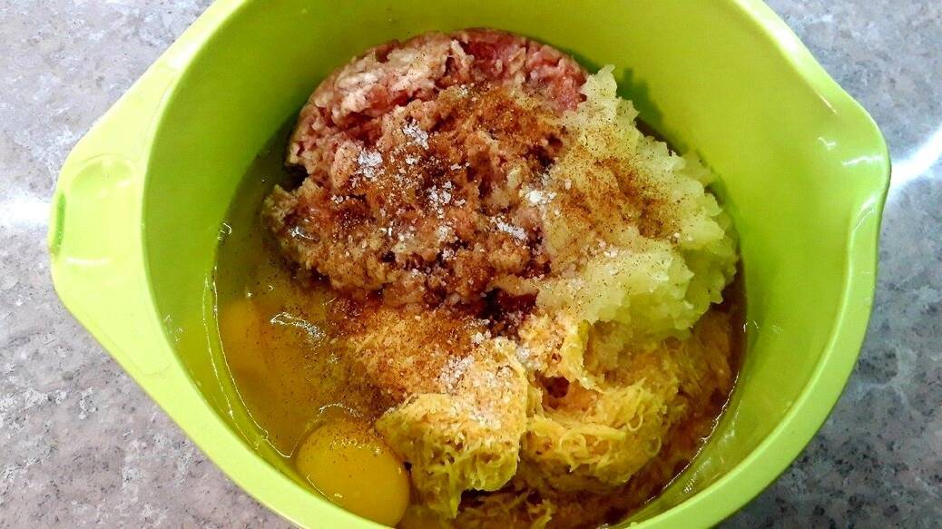 - В глубокой миске соедините натертый картофель, репчатый лук, мясной фарш, добавьте куриные яйца, соль, черный молотый перец (можно приправить своими любимыми специями), по желанию можно добавить измельченную зелень и все тщательно перемешайте. Готовый фарш накройте крышкой или затяните пищевой пленкой и поставьте в холодильник на 30 минут.