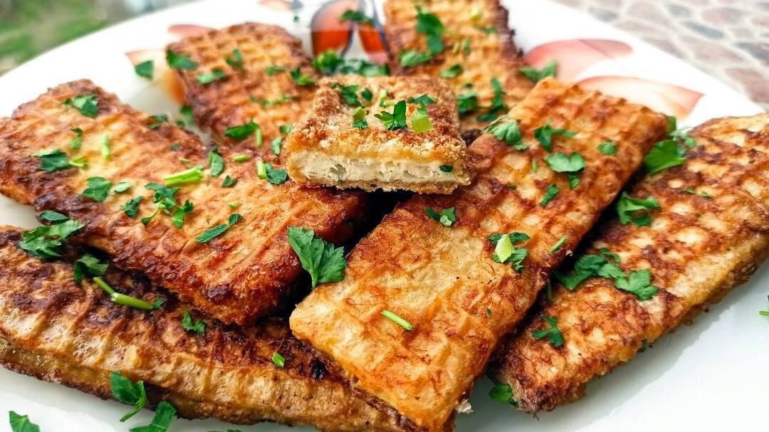 - Каждый нарезанный кусочек окуните в яичную смесь, выложите на разогретую сковороду с растительным маслом и обжарьте на небольшом огне до золотистой корочки, затем переверните, накройте крышкой и продолжайте готовить при минимальном нагреве еще около 5 минут.