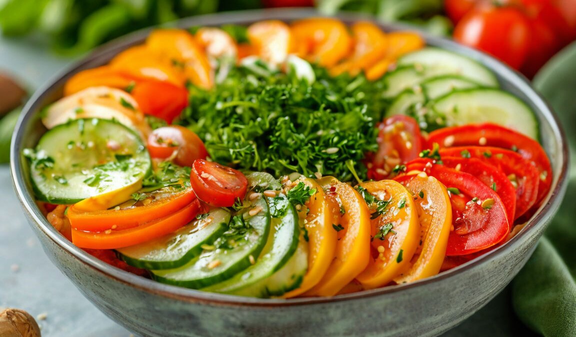 Чтобы салат стал основным блюдом для похудения, его основой должны быть низкокалорийные овощи. Листовая зелень (шпинат, руккола, салат-латук), огурцы, помидоры, редис, брокколи — это только некоторые из них. Эти продукты богаты клетчаткой, которая способствует насыщению, и содержит минимальное количество калорий. Старайтесь избегать высококалорийных ингредиентов, таких как картошка или бобовые, если ваша цель — снизить вес.
