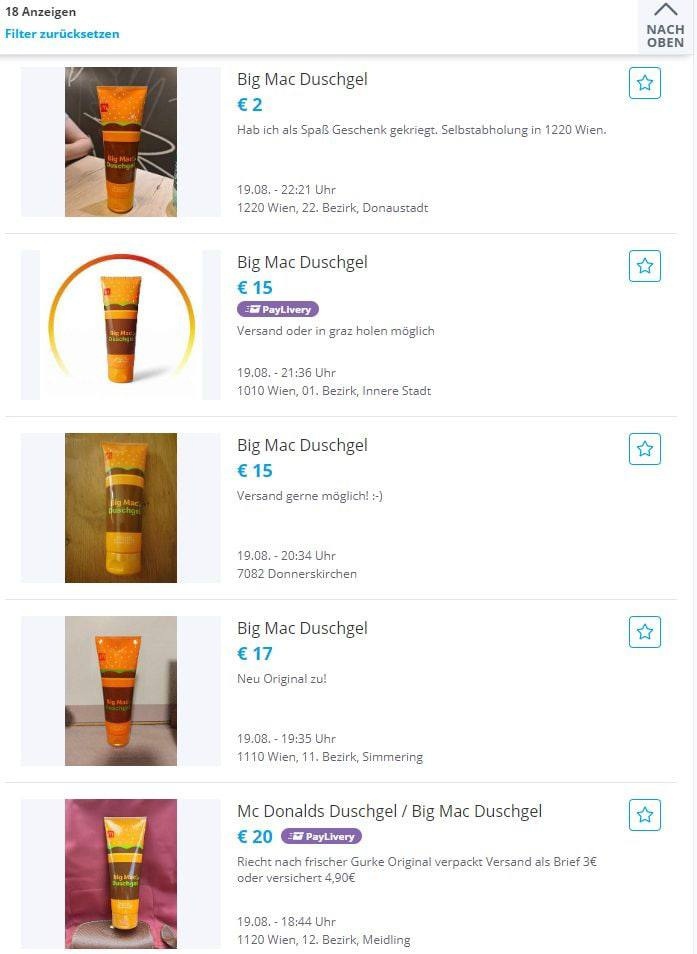 В Австрии местный «Макдоналдс» выпустил гель для душа с ароматом «Биг Мака». Купить его можно лишь за баллы в приложении или на местных сайтах объявлений. Покупатели, решившие перепродать завтеный гель, обнаружили что он с запахом огурцов. А рассчитывали они, что гель будет с запахом булочек с мясом.