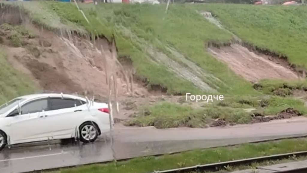 Склон на проспекте Победы у ж/д моста сошел на дорогу