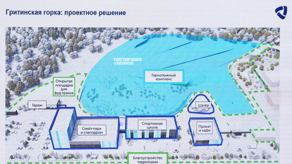 Проект сложный, строительство займет несколько лет. В основе будет склон Гритинской горки с трассой для ватрушек. Появится прокат спортинвентаря, кафе, большая парковка (на 105 машиномест, сообщалось ранее). А также спортивная школа и спортивный центр со скейт-парком и скалодромом.