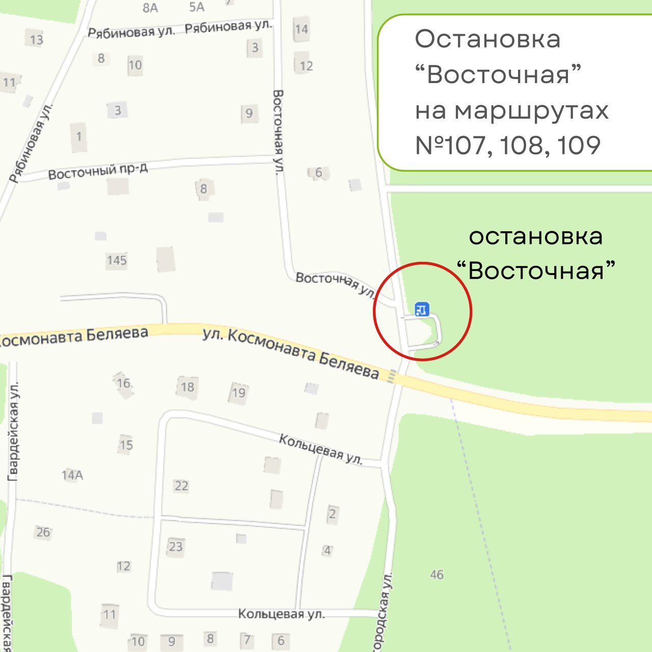 На межмуниципальных маршрутах № 107, 108, 109 (город и район) с 15 декабря добавляется остановка «Восточная» - и в прямом, и в обратном направлениях. Там действует городской тариф, а по транспортной карте «Поехали!» возможна бесплатная пересадка на другие маршруты Автоколонны №1456.