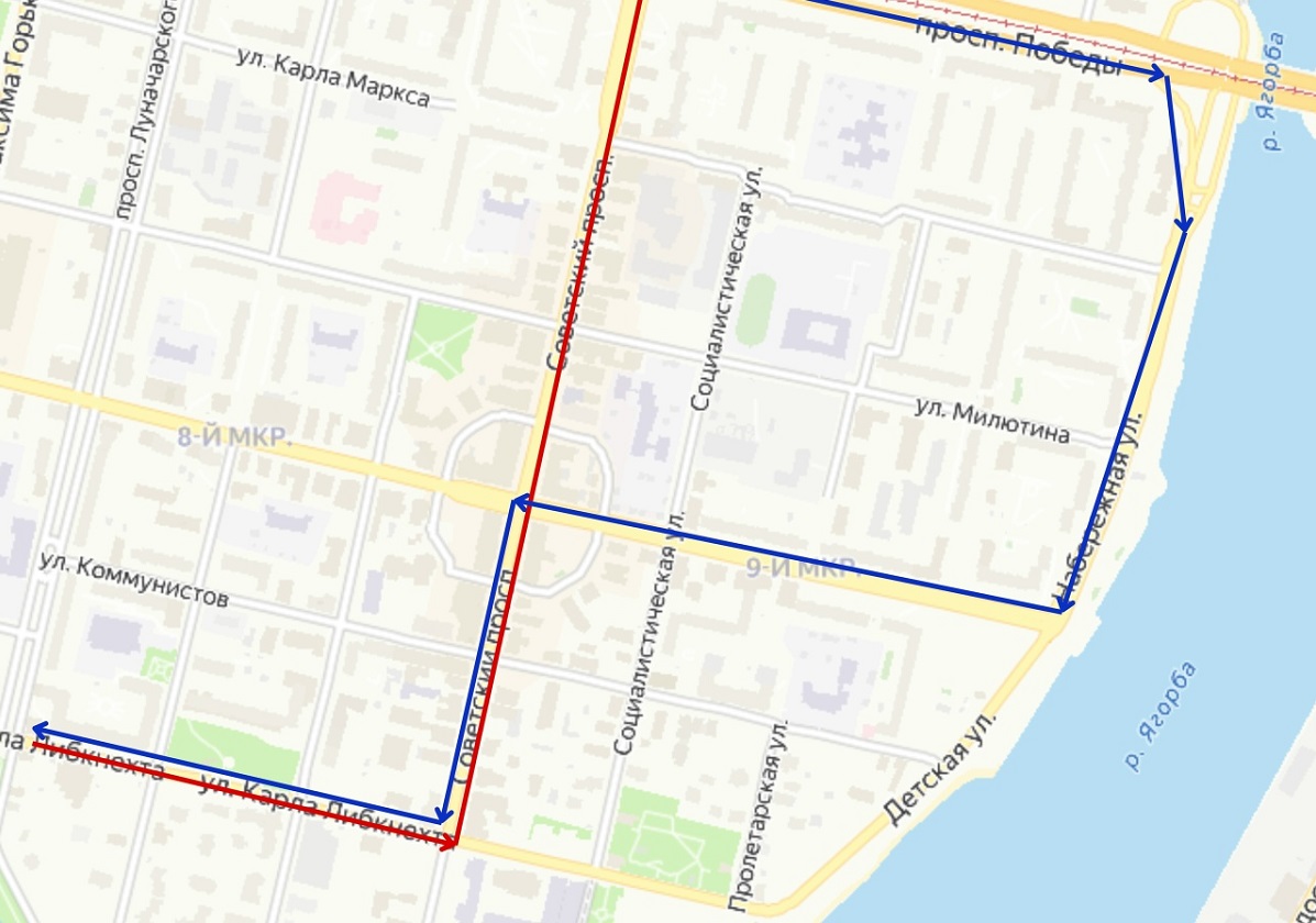 Поэтому с 15 декабря маршрут автобусы №4 из Зашекснинского района поедут прямо по Советскому проспекту, затем свернут в сторону вокзалов. В обратном направлении - из Заягорбского района - схема не меняется.