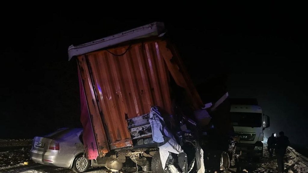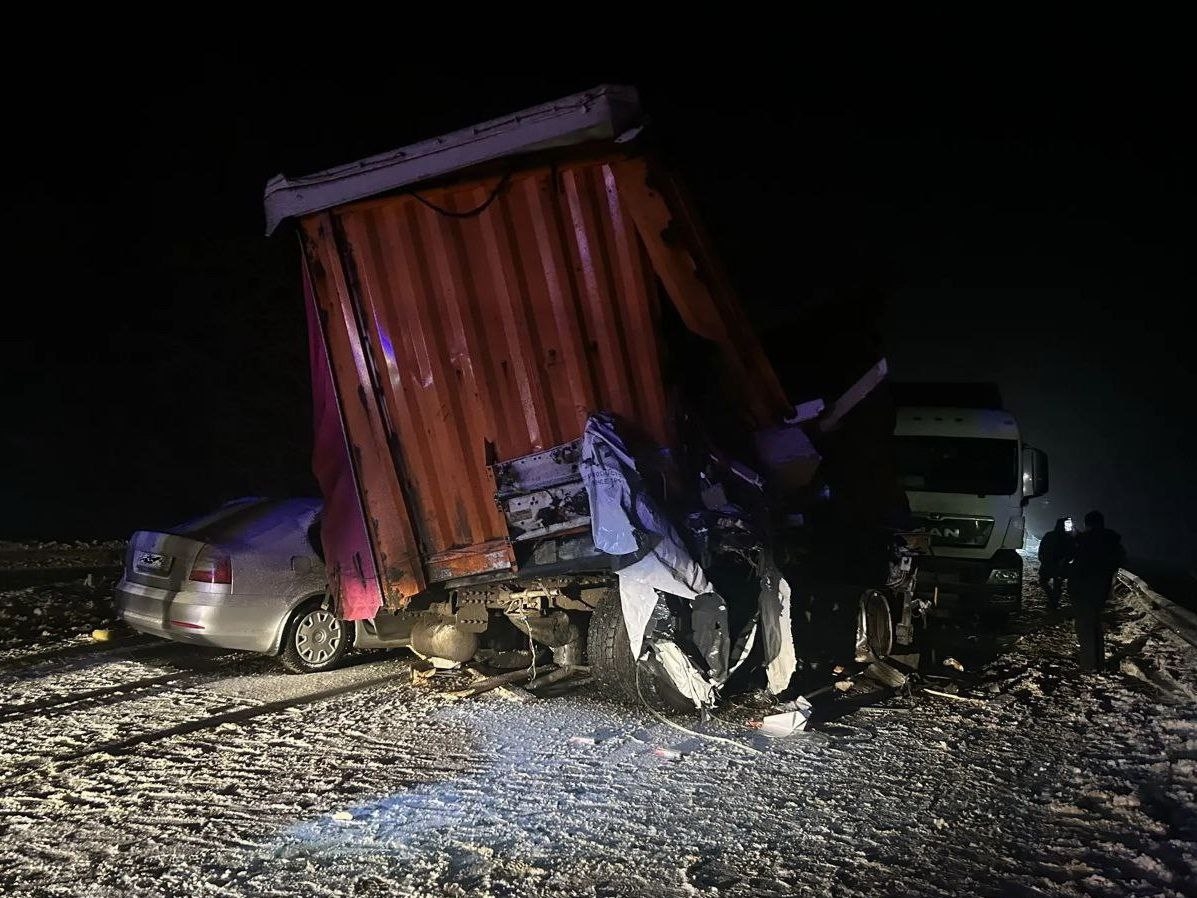 Столкнулись 4 машины - КамАЗ с полуприцепом, грузовой «Рено Магнум» с полуприцепом, грузовик «Ман» с полуприцепом и «Шкода Октавиа». Погибли водитель КамАЗа и пассажир «Рено Магнум» 1991 г.р. Водители «Рено» и «Шкоды» получили различные травмы.