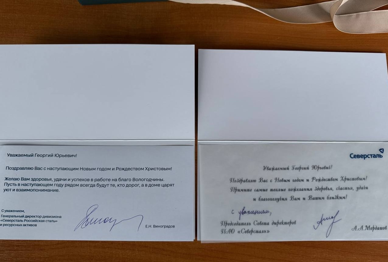 Председатель совета директоров ПАО «Северсталь» Алексей Мордашов и гендиректор дивизиона «Северсталь Российская сталь» и ресурсных активов Евгений Виноградов направили поздравительные открытки и подарочный набор с черным и зеленым чаем, деревянной ложкой, деревянным расписным туеском и шоколадными конфетами.