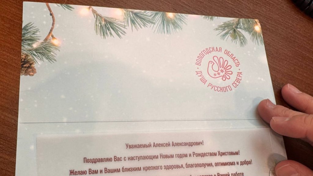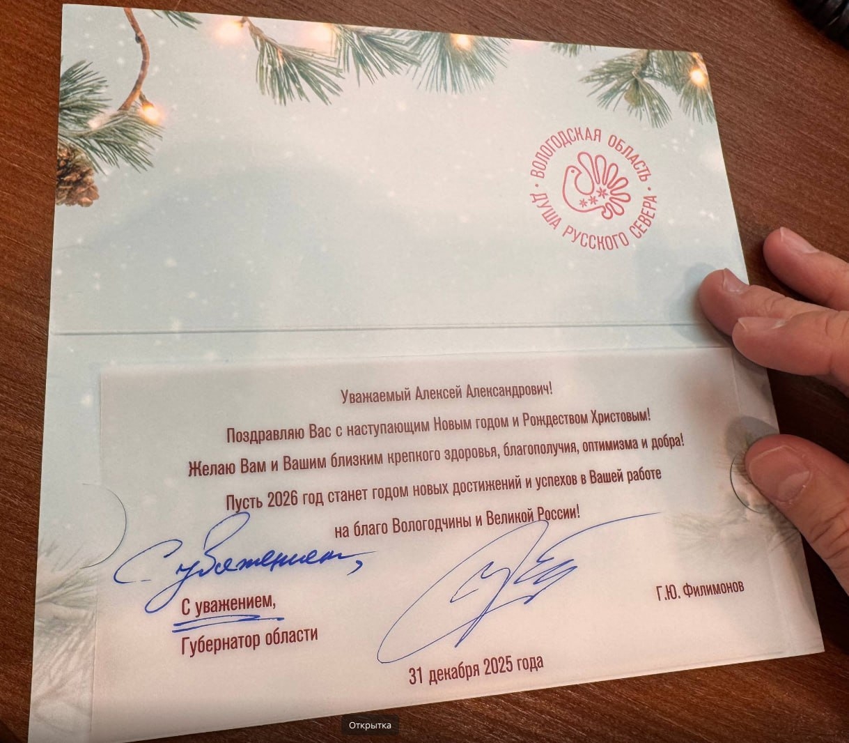 Губернатор Георгий Филимонов ответил поздравительной открыткой и сундучком настоящих вологодских продуктов.