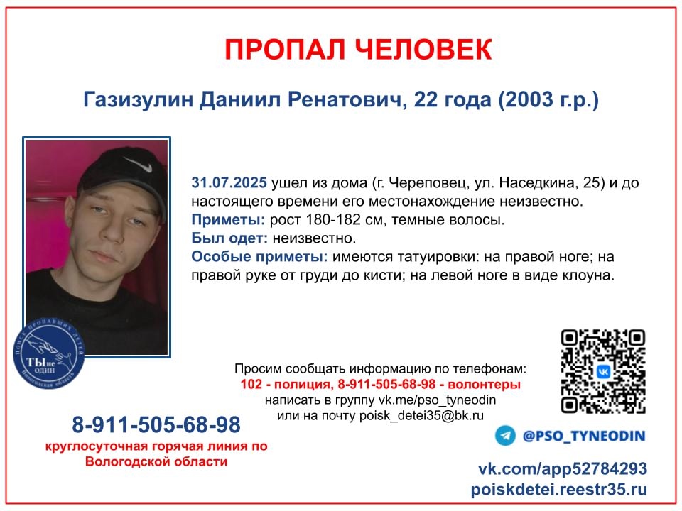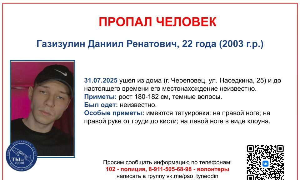 Поисково-спасательный отряд «Ты не один» опубликовал ориентировки на Даниила Газизулина и Алексея Авдеенко. Первый ушел из дома на улице Наседкина 31 июля 2025 года, с того дня связь с ним прервалась.
