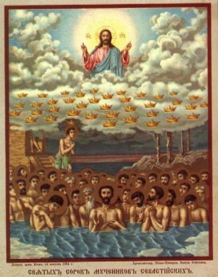 Сорок христиан были зимой отведены на озеро и раздеты. Возле озера была растоплена баня, чтобы те, кто от пытки холодом, захотевший отречься от Христа могли в ней согреться. Всю ночь воины мужественно переносили лютый мороз, ободряя друг друга и поя священные гимны Богу.