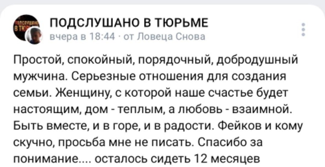 Если женщину это не смущает, она попалась, и он может гордиться собой. Бесперебойный поток необходимых вещей для него и его сокамерников обеспечен. А кто поможет заключенному, если его жена или подруга с воли от него отвернулась, когда она попал в тюрьму? Нужно искать новую подругу.