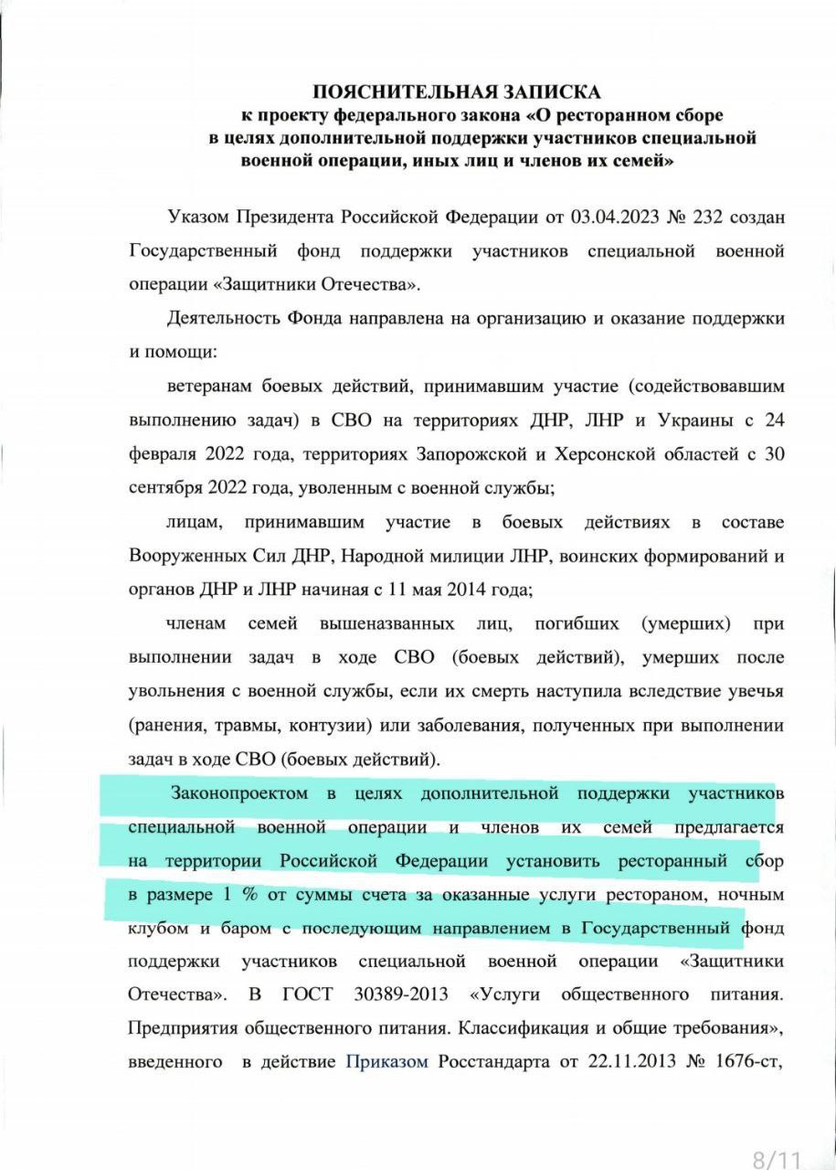 Депутаты Госдумы Мархаев и Матвеев внесли законопроект о «ресторанном сборе» в 1%. Они предлагают, чтобы посетители доплачивали 1% от суммы своего заказа. Эти деньги заведение отправит в федеральный бюджет и предполагается, что деньги пойдут в фонд поддержки семей участников СВО. Пока законопроект не касается кафе, столовых, фастфудов и другого общепита. И пока предлагается брать сбор только с совершеннолетних.