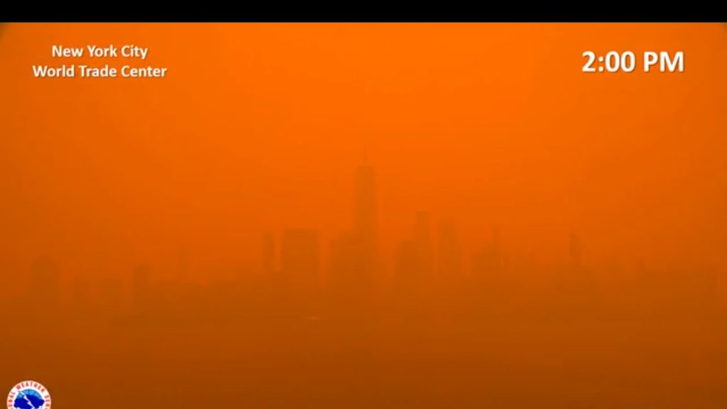 Нью-Йорк окутало оранжевым дымом и смогом от лесных пожаров в Канаде. Положение становится опасным для жителей.