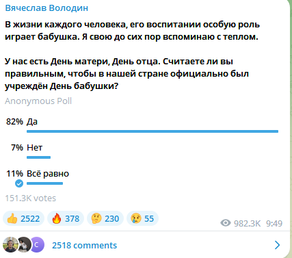 «У нас есть День матери, День отца. Считаете ли вы правильным, чтобы в нашей стране официально был учрежден День бабушки?» — написал он.