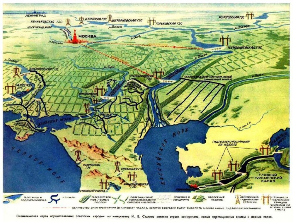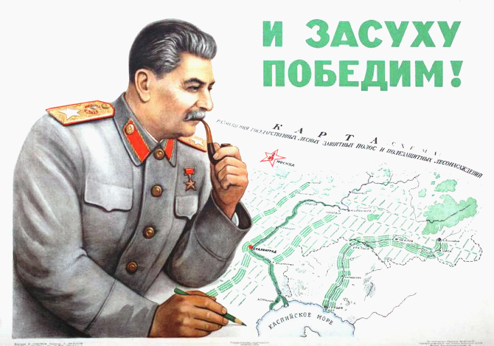 Искусственные водоемы для урожайности и защитные лесополосы. В России урожайность зерновых неустойчива по годам, очень зависит от меняющихся природных условий. Ранее засухи приводили к голоду. Голод был даже в 1946, когда засуха охватила более 50% посевных площадей страны. Решение Совмин СССР и ЦК ВКП(б) кратко называлось «Сталинский план преобразования природы». В течение 1949-1965 планировалось создать 8 лесных полос в степных и лесостепных районах страны протяженностью более 5300 километров и 44 228 прудов и водоемов для орошения. Цель плана – предотвращение засух и пылевых бурь с помощью создания искусственных водоемов для орошения, высаживания лесозащитных насаждений и внедрения травопольного севооборота. Результатами выполнения были бы значительный рост показателей с/х, увеличение объемов дешевой электроэнергии, защита природы. Планы Сталина был выполнен лишь частично. Отказ от выполнения плана полностью был одной из причин эрозии почв в 1960-х, дефиците муки тогда же и началу закупок зерна за рубежом. Иностранное зерно стало основой советского хлеба и сельского хозяйства.