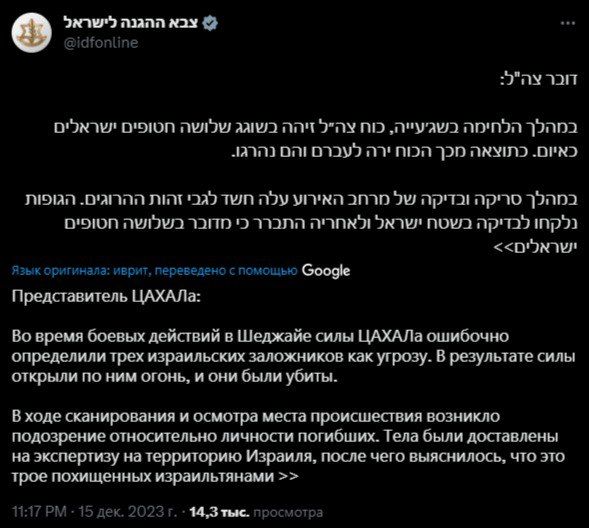 Израильская оккупационная армия опубликовала сообщение, где признала ответственность за убийства мирных граждан - израильтян. Было сказано, что ЦАХАЛ расстрелял троих похищенных ХАМАСом заложников «по ошибке». Все трое заложников скончались.