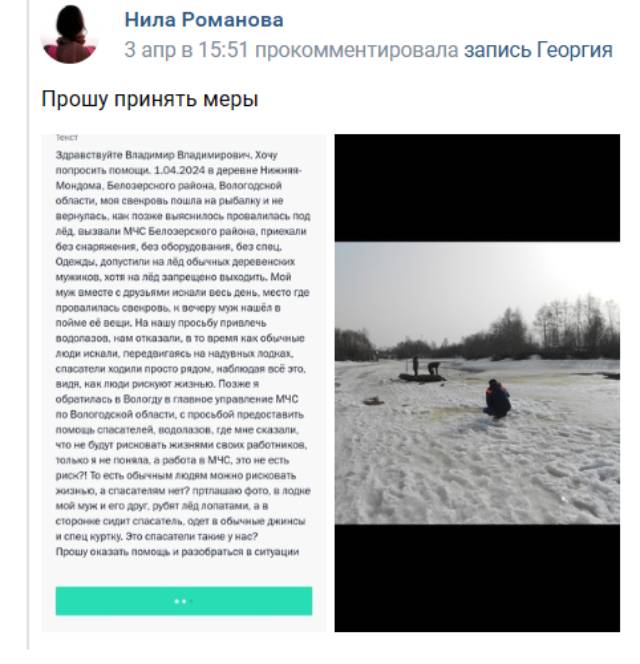 Женщина обратилась в областное управление МЧС с просьбой предоставить водолазов. По ее словам, там ответили, что не собираются рисковать людьми. Читательница возмущена, что простым людям пришлось самим рискнуть жизнями. Как доказательство она приложила фото. По словам женщины, на надувной лодке ее супруг с другом рубят лед лопатами, а сотрудник МЧС наблюдает неподалеку. Одет он в простые джинсы. Куда обращаться с жалобой, вологжанка просто не знает.