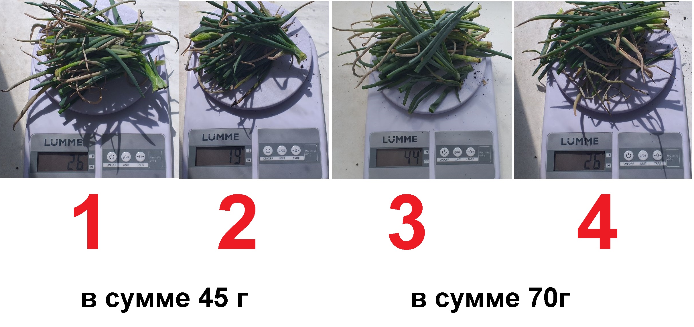 Видно, что лук под током был более урожайным: 70 г против 45 г без тока. И лук, который был под током по 2,5 минуты, показал урожайность 44 г против лука, который был под током по 5 минут, у которого 26 г.