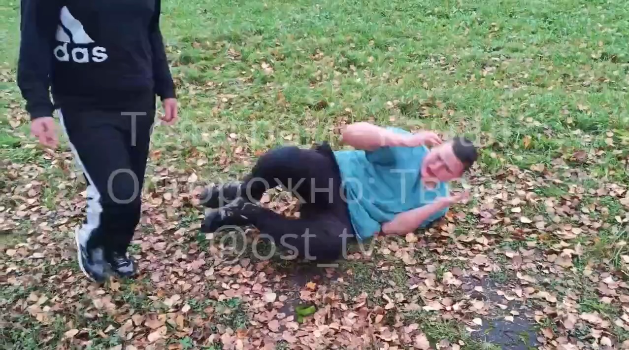 В тверском Нелидово скандал. На фоне бараков (там их называют дома) и школы, группа молодежи (часть из них была в балаклавах) наблюдала за дракой двух ровесников.