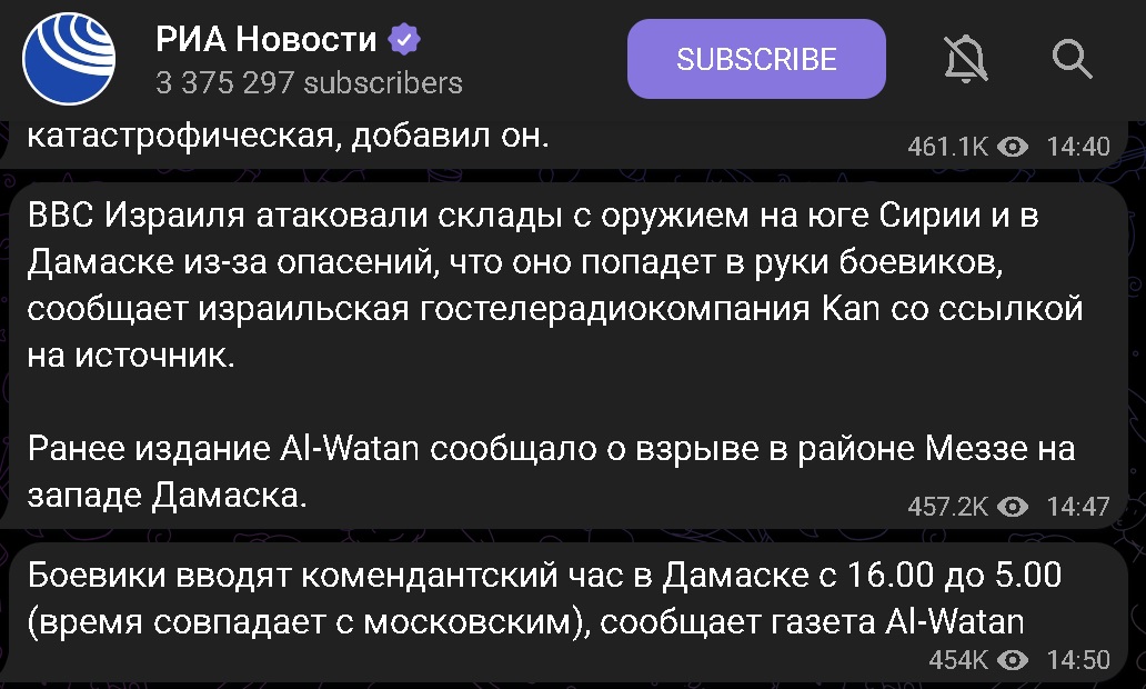 Интересно посмотреть, как меняется риторика МИД РФ и российских МИИ применительно к Асаду и его противникам в Сирии. 6 декабря министр Лавров в интервью Карлсону говорил о «сепаратистах и террористических исламских группировках» в Сирии.