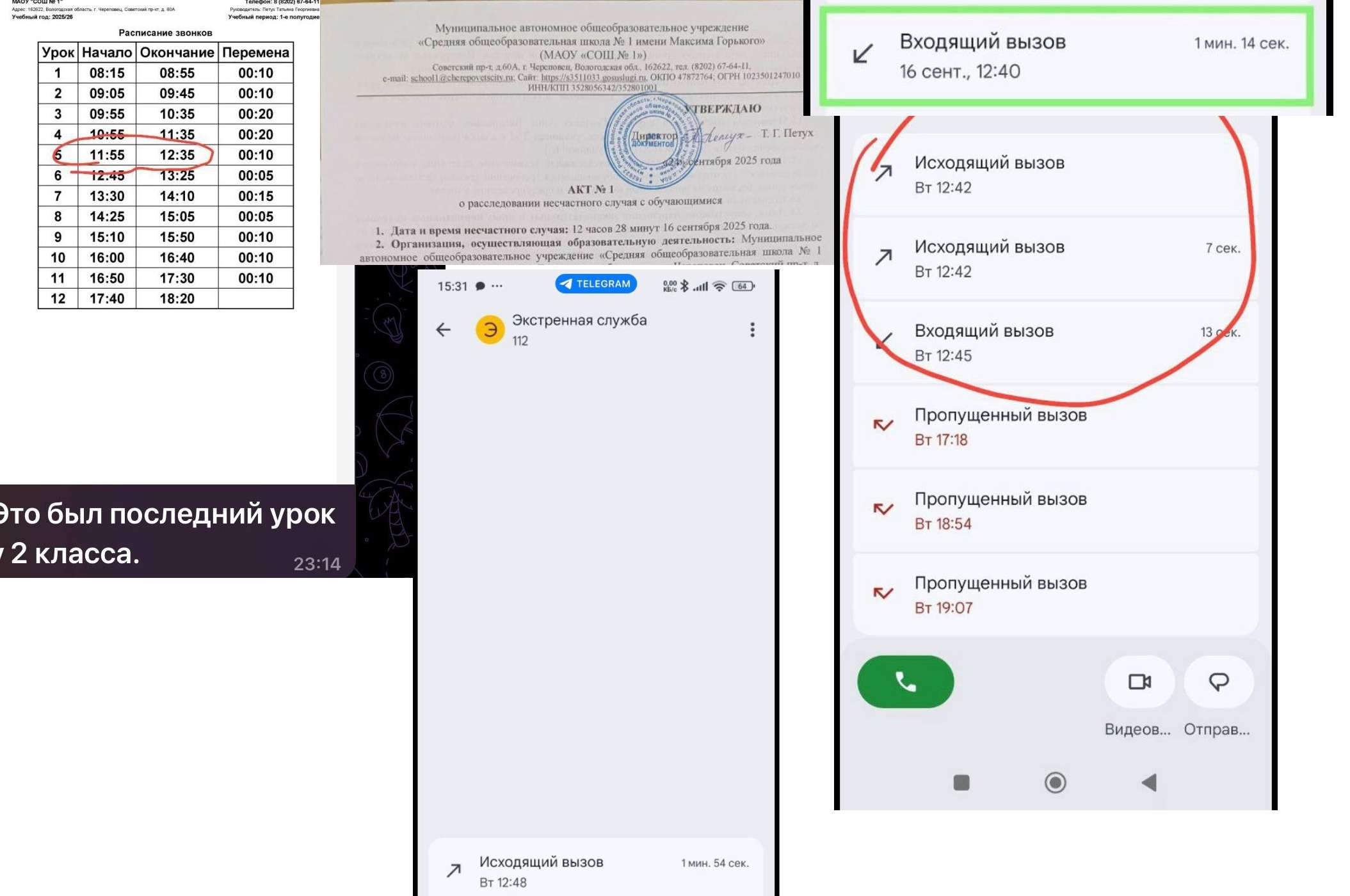 "Мы, с согласия родителей, предоставляем доказательную базу в подтверждение материнской боли в своем обращении к нам. Последний урок заканчивался в 12 ч. 35 мин., что подтверждается расписанием звонков на 16.09.2025. Происшествие произошло в 12 ч. 28 мин., что подтверждается актом Nº 1. о расследовании несчастного случая с обучающимся от 24.09.2025 г. В 12 ч.40 мин. с телефона сына маме звонил одноклассник, который и сообщил маме о несчастном случае с ее сыном, так как сам мальчик был не в состоянии сам позвонить, что подтверждается запрошенной детализацией звонков от 16.09.2025 г. После, в 12 ч.42 мин., мама сразу же звонит учителю, который не берет трубку. Мама набирает повторно учителя, что подтверждается запрошенной детализацией звонков от 16.09.2025г. Так мама от учителя находит подтверждение слов одноклассника сына о произошедшем с ее ребенком. Далее, в 12 ч. 45 мин., учитель впервые звонит маме с просьбой вызвать скорую помощь для своего сына, что подтверждается запрашиваемой детализацией звонков от 16.09.2025 г. В 12 ч.48 мин. мама, прибежав с работы в школу, вызывает сама скорую помощь, потому что школа ее не вызвала, что подтверждается запрашиваемой детализацией звонков от 16.09.2025 г. Школа ждала маму для вызова скорой помощи. Скорая приехала через 6 минут после вызова. Предоставляем видео, во сколько скорая заезжает в школу - 13 ч. 16 мин. С момента происшествия прошло 48 минут. У кого-нибудь есть еще вопросы? А вот почему скорая помощь так поздно смогла попасть на территорию школы, мы бы хотели услышать от администрации школы. Мы знаем причину".
