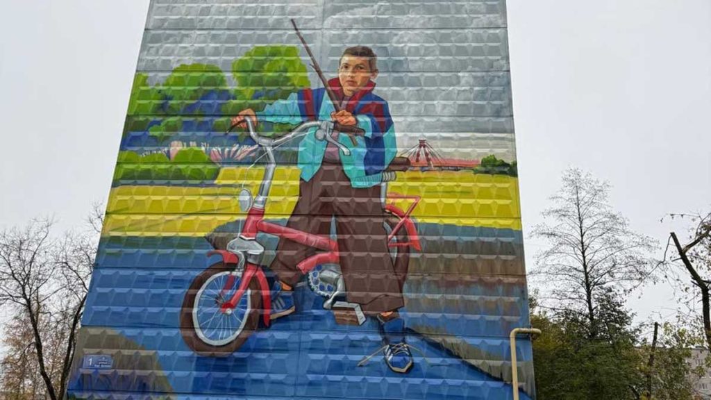 На стене одного из домов художник изобразил мальчика с палкой, едущего на велосипеде, а над ним — всадника на белом коне, Великого князя Александра Невского. Как рассказал автор, юный персонаж — реальный человек, 19-летний парень, погибший в зоне специальной военной операции.