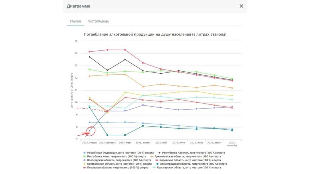 На деле, согласно уточнённым данным Росстата, за девять месяцев 2025 года потребление спиртного в Вологодской области практически не изменилось.