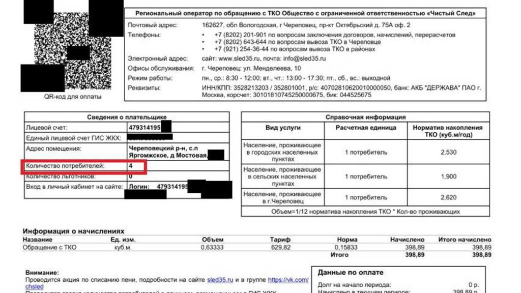 В редакцию городского канала @gorodche начали поступать обращения от жителей Череповца, заметивших резкое увеличение начислений за услуги компании «Чистый след». Как сообщают горожане, в квитанциях неожиданно появились «дополнительные» потребители, что привело к росту платежей — в некоторых случаях почти вдвое. Так, вместо двух зарегистрированных человек в документе могли оказаться указаны четыре.