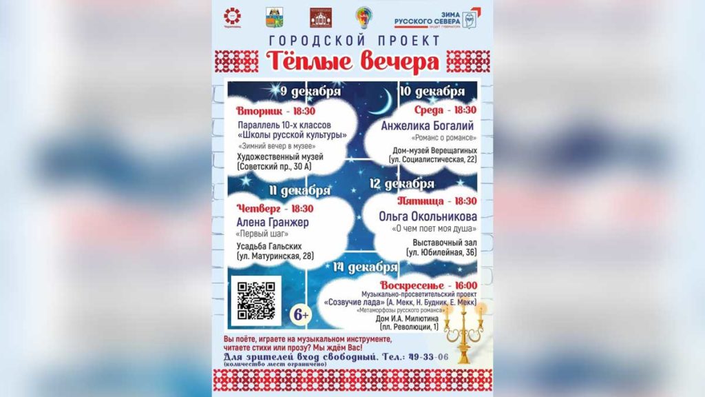 В Череповце опубликована афиша очередной недели городского проекта «Тёплые вечера», который приглашает жителей провести время в камерной атмосфере городских музеев и культурных площадок. Горожан ждут выступления творческих коллективов, романсы и уютные зимние встречи. Вход на все мероприятия остаётся свободным.