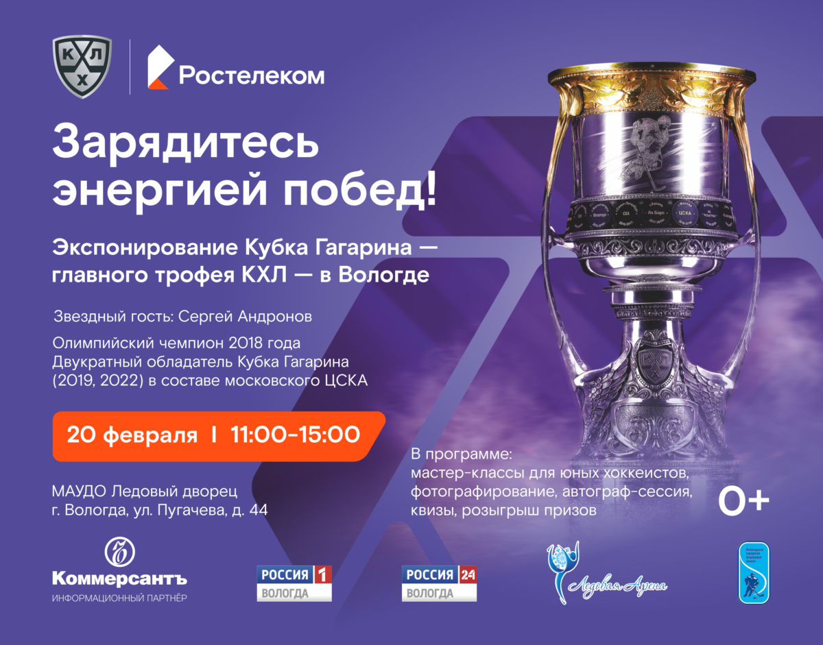 Кубок можно будет увидеть на двух площадках. 19 февраля он будет экспонироваться в спортивном комплексе «ВологдАрена» с 18:30 до 19:30 по адресу: ул. Поэта Романова, д. 1. У всех желающих будет возможность сфотографироваться с главным трофеем Чемпионата КХЛ и Сергеем Андроновым, задать спортсмену вопросы и получить автограф. Кроме того, все гости смогут принять участие в квизах и получить сувениры.