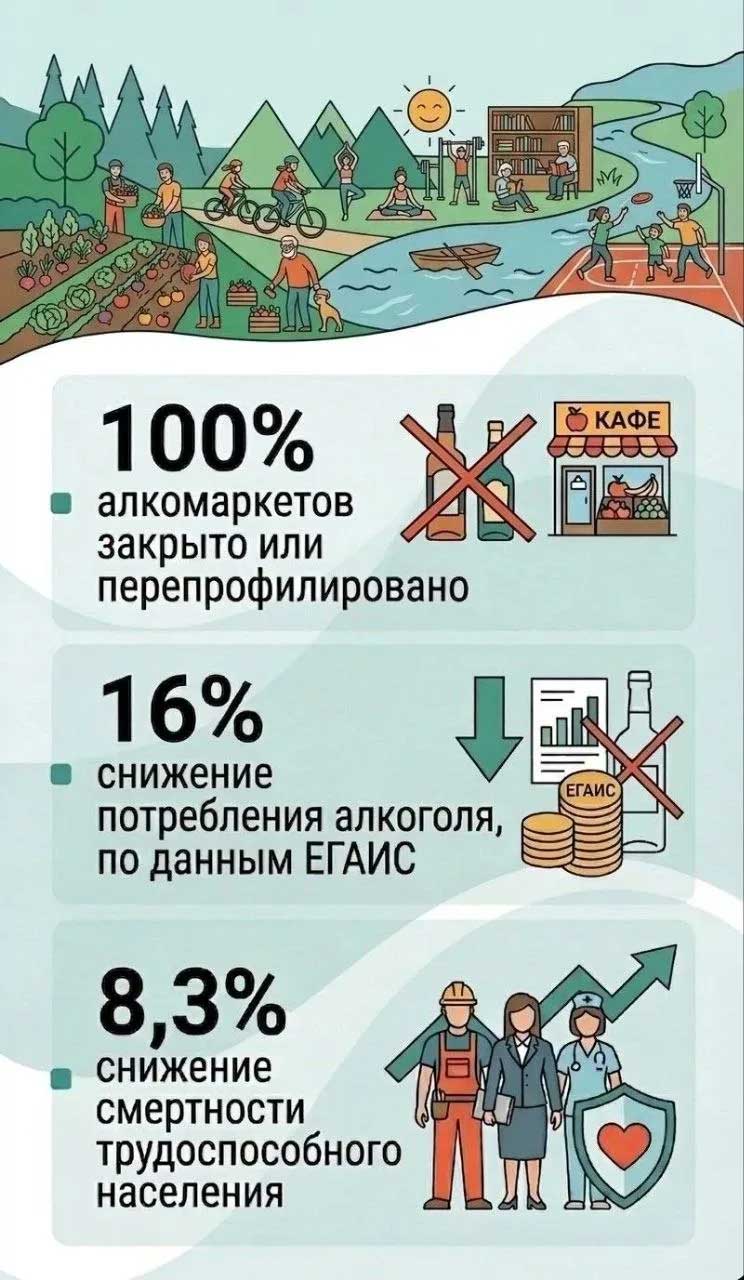 Дополнительным индикатором социальных изменений стало снижение потребления алкоголя на 16%. Параллельно на 8,3% сократилась смертность среди трудоспособного населения. В регионе также завершена трансформация сети алкомаркетов: часть из них закрылась, остальные сменили профиль деятельности.