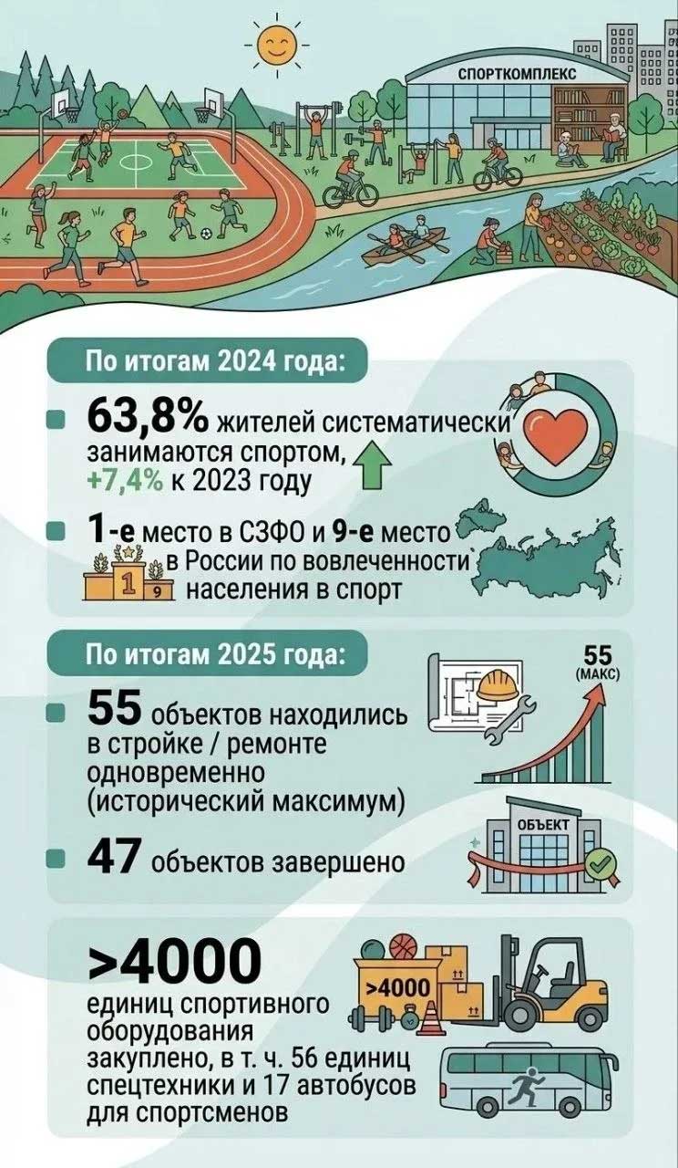 Значительные результаты достигнуты и в сфере спорта. Регулярно физической активностью занимаются 63,8% жителей области. За последнее время построено 47 спортивных объектов, а также закуплено свыше 4 тысяч единиц оборудования. По уровню вовлеченности населения в занятия спортом регион стал лидером Северо-Западного федерального округа и занял 9-е место по стране.